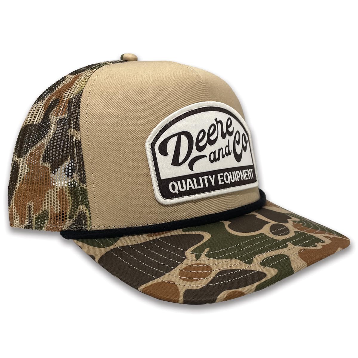 - AUTHENTIC DESIGN: John Deere, Deere & Co trucker hat featuring a quality equipment patch logo on tan crown with camouflage pattern details