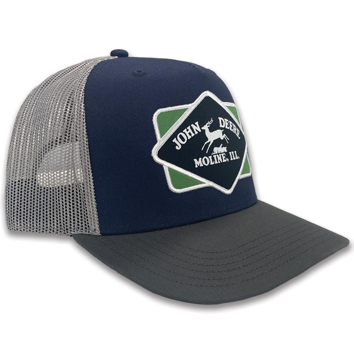 - CLASSIC DESIGN: Navy blue and charcoal trucker hat featuring the iconic John Deere diamond patch logo with Moline branding