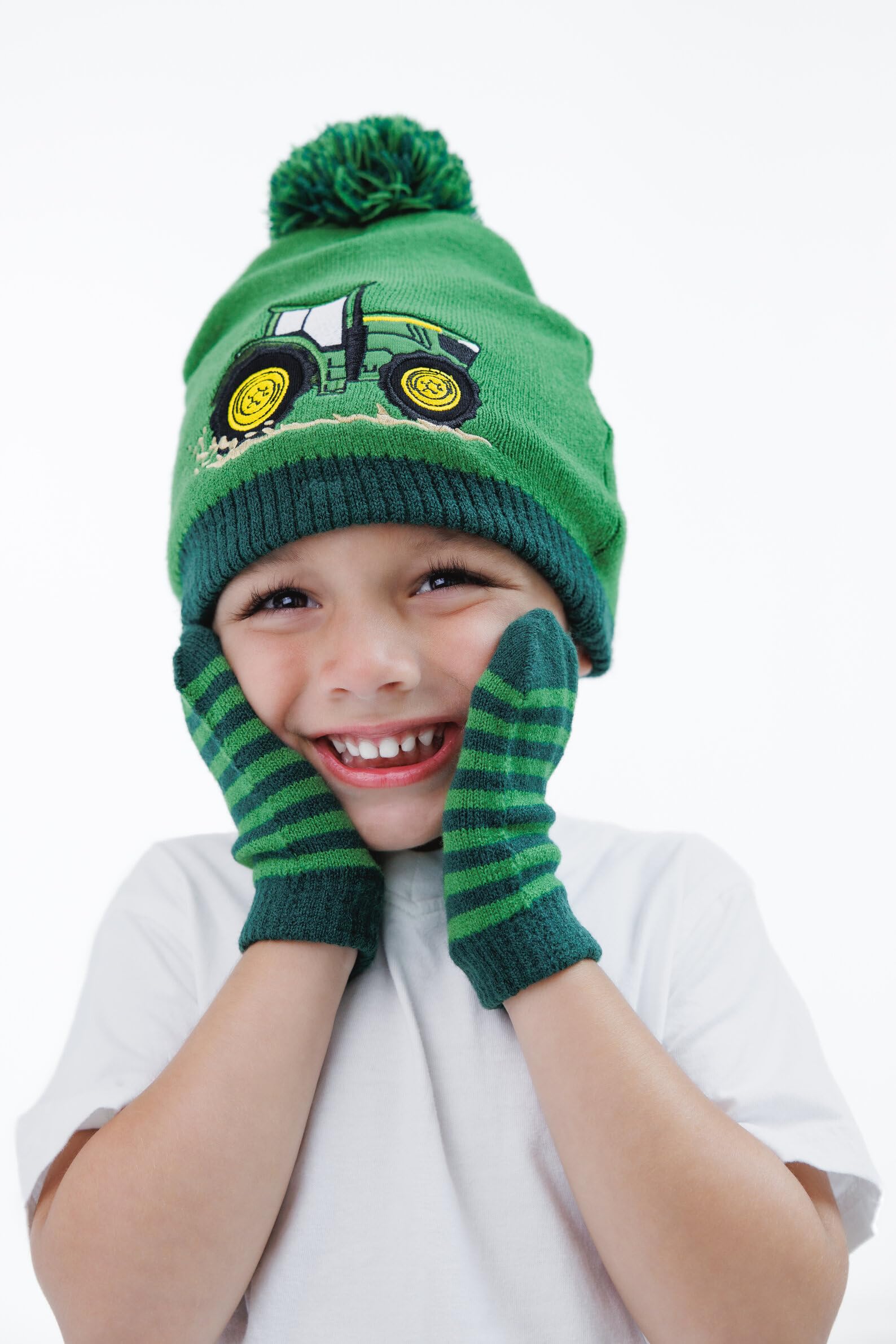 John Deere Tractor Kids Pom Pom Beanie and Mittens Cold Weather Set for Toddlers One Size